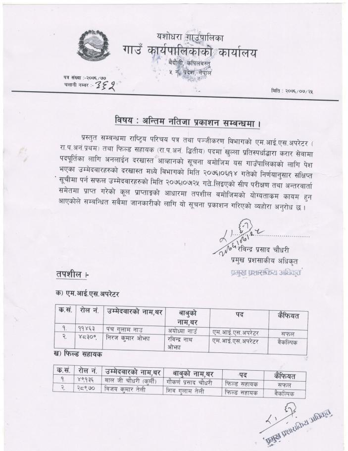 एम आइ एस अपरेटर तथा फिल्ड सहायक पदमा सफल उम्मेदवार सम्बन्धि सूचना