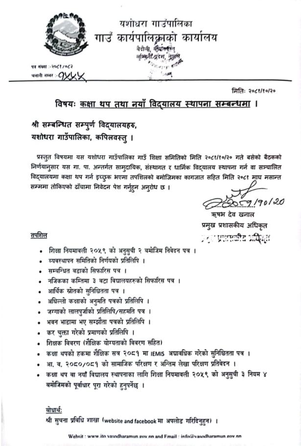 कक्षा थप तथा नयाँ विद्यालय स्थापना सम्बन्धमा ।