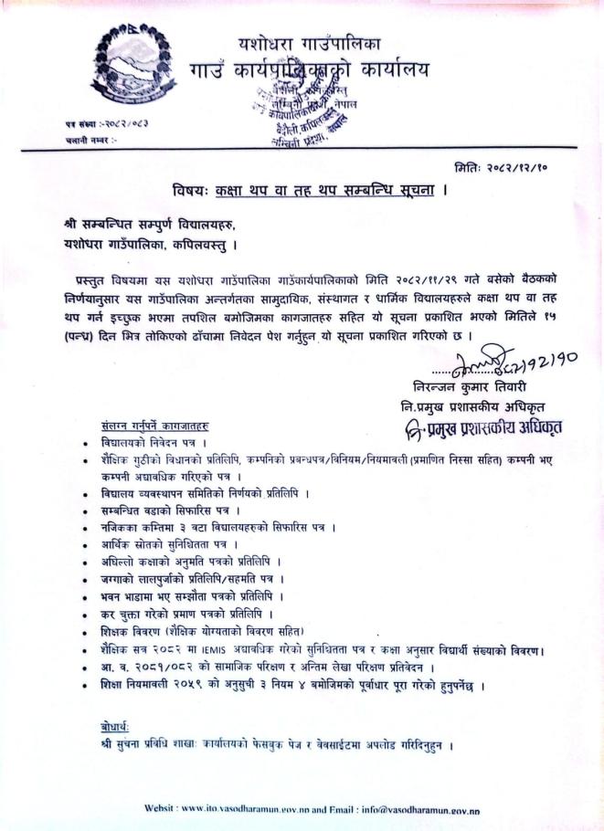 कक्षा थप वा तह थप सम्बन्धि सूचना ।