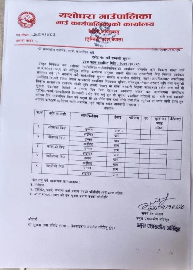 कृषि तर्फ दररेट पेश गर्ने सम्बन्धि सूचना ।