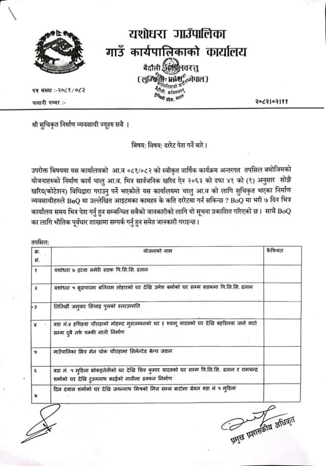 दररेट पेश गर्ने सम्बन्धमा ।