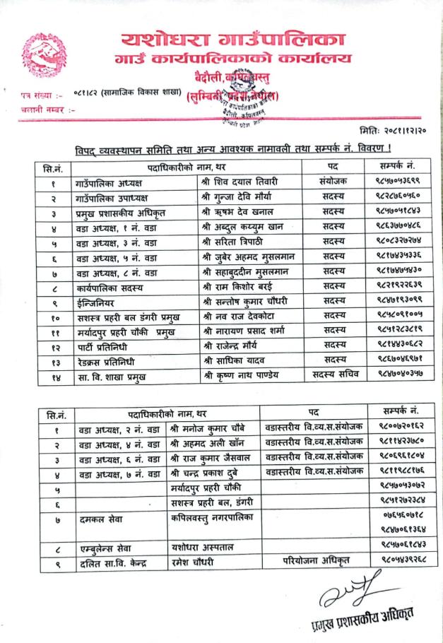 विपद् व्यवस्थापन समिति तथा अन्य आवश्यक तथा सम्पर्क नं विवरण
