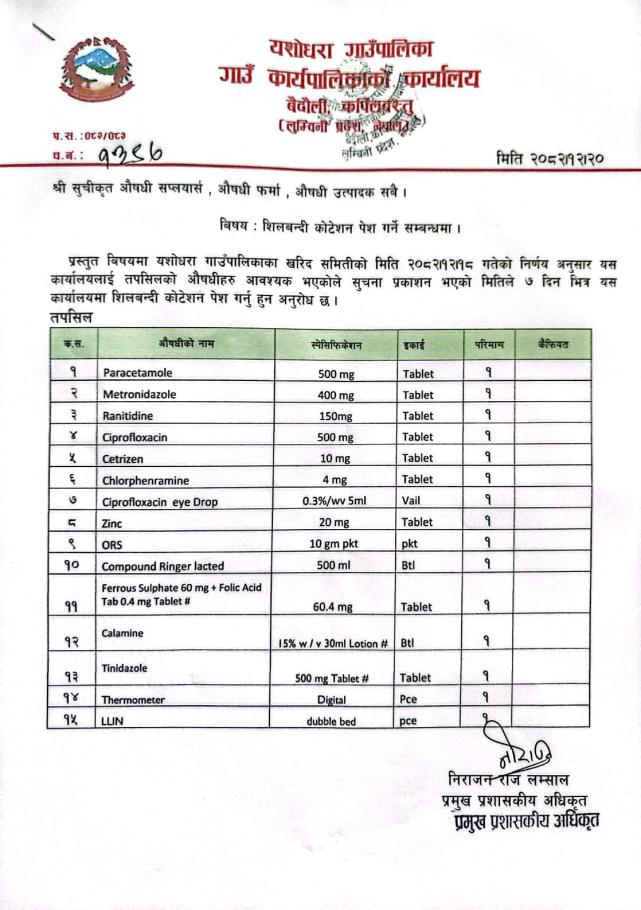शिलवन्दी कोटेशन पेश गरिएको ।