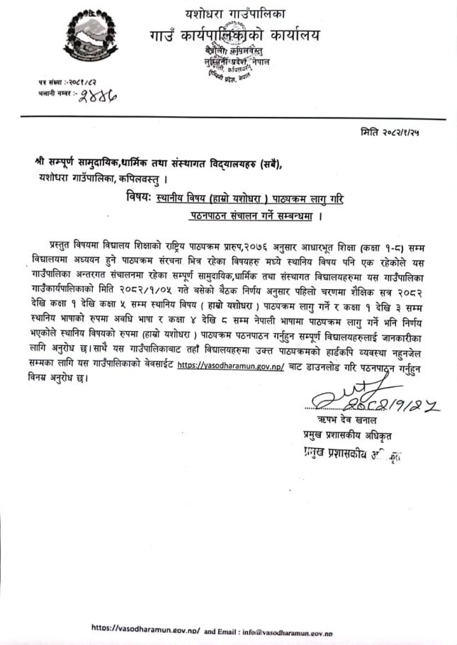 स्थानीय विषय (हाम्रो यशोधरा) पाठयक्रम लागु गरी पठनपाठन संचालन गर्ने सम्बन्धमा ।