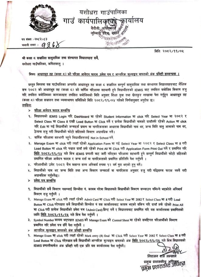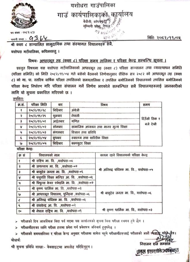 आधारभूत तह(कक्षा ८) परीक्षा तालिका र परीक्षा केन्द्र सम्बन्धि सूचना ।