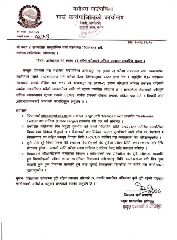 आधारभूत तह (कक्षा ८) उत्तीर्ण परीक्षाको नतिजा प्रकाशन सम्बन्धि सुचना ।