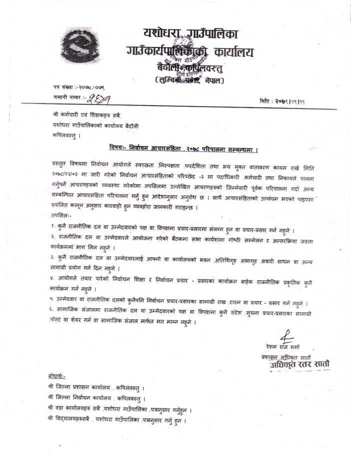 निर्वाचन आचारसंहिता २०७८ परिपालना सम्बन्धमा ।