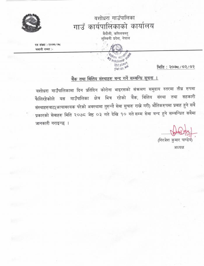 बैंक तथा वित्तिय संस्थाहरु बन्द गर्ने सम्बन्धमा ।